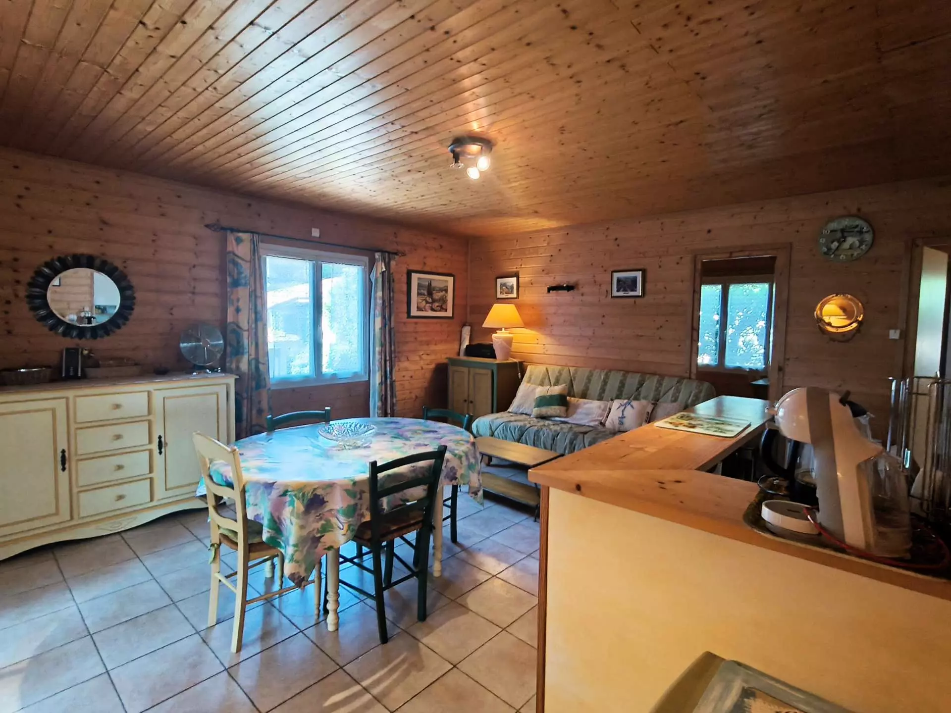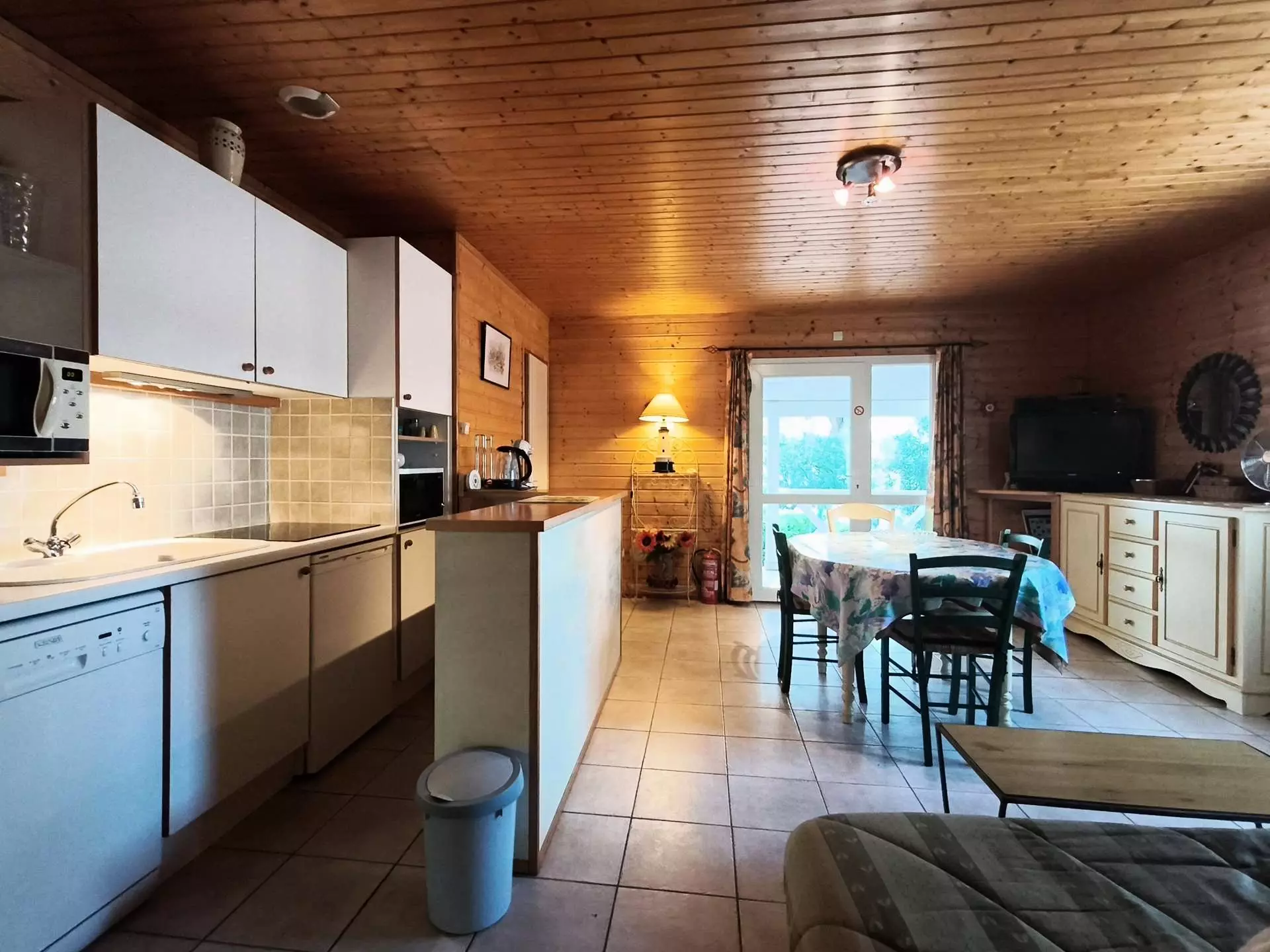 Das Wohnzimmer und die ausgestattete Küche öffnen sich zur Terrasse.