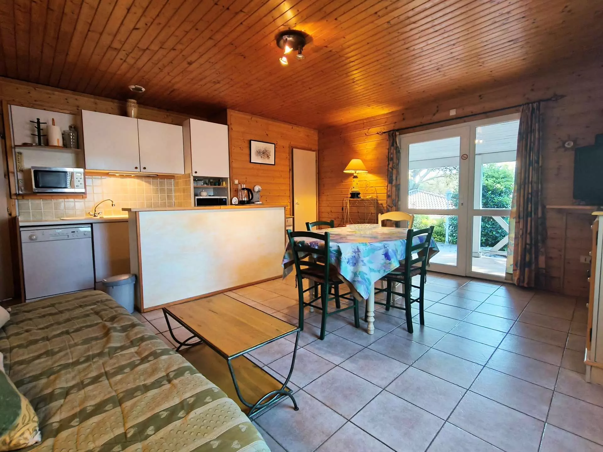 Das etwa 60 m² große Haus verfügt über eine überdachte Holzterrasse im Freien. Es ist mit einem Essbereich ausgestattet.
