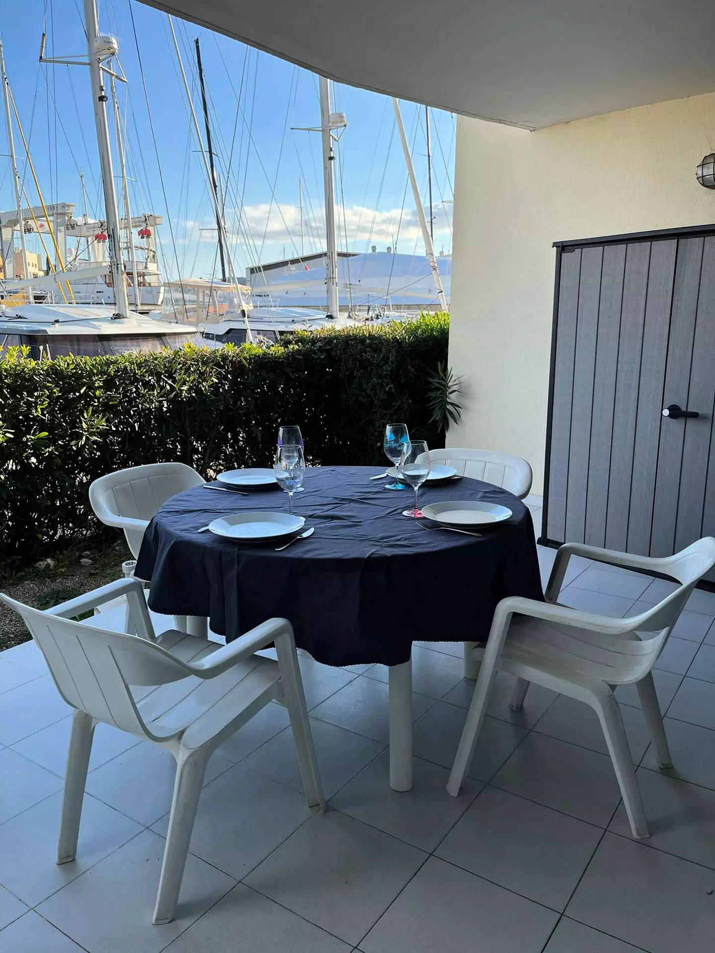 Das Wohnzimmer und das Schlafzimmer öffnen sich zu einer großen, nach Südwesten ausgerichteten Terrasse, die sich ideal für Mahlzeiten im Freien eignet und einen atemberaubenden Blick auf den Jachthafen und den Golf von Saint-Tropez bietet.