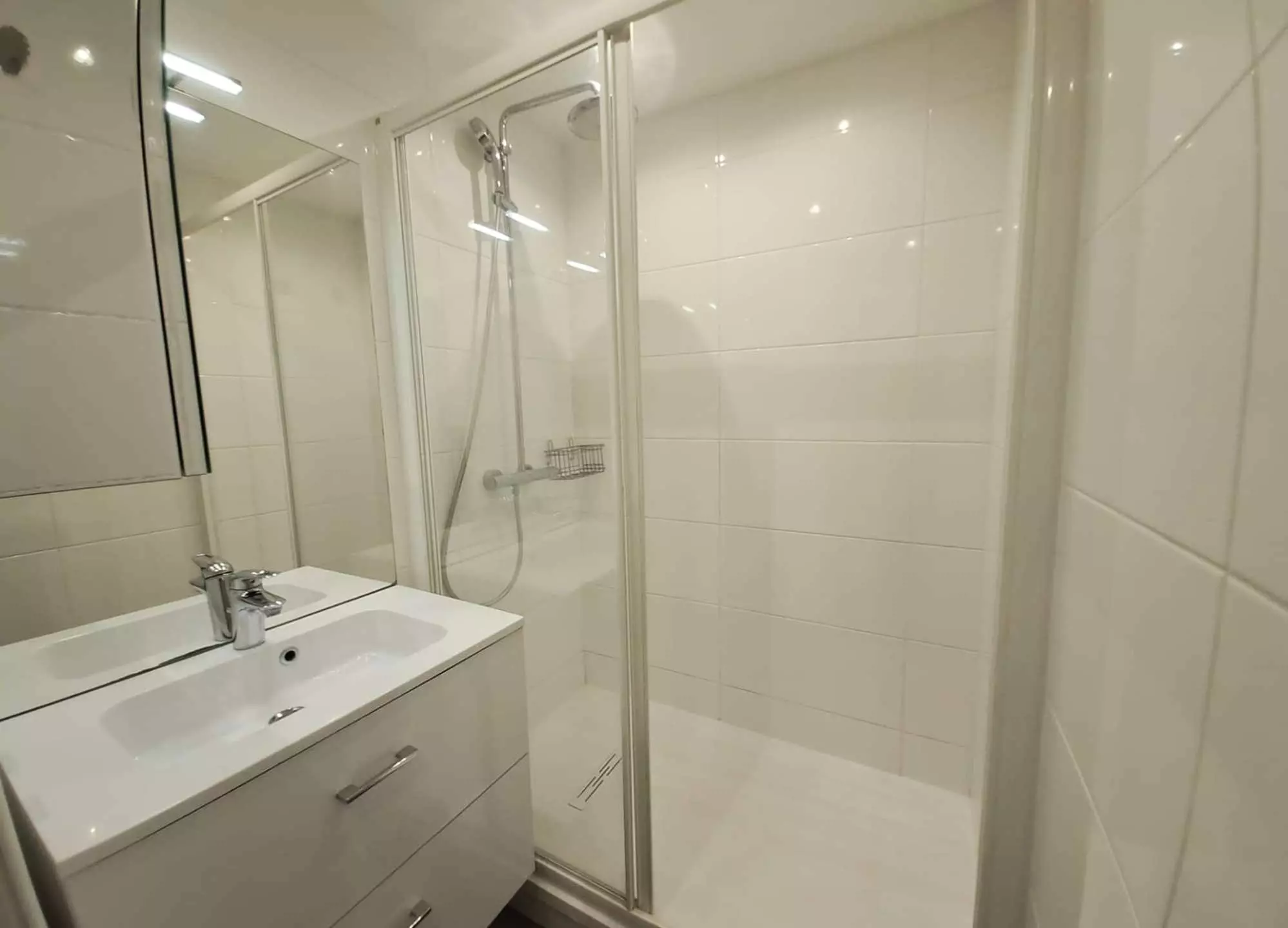 Ein modernes Badezimmer mit ebenerdiger Dusche.